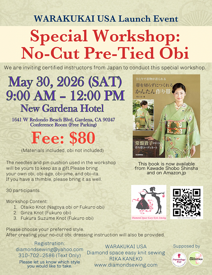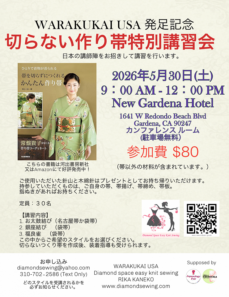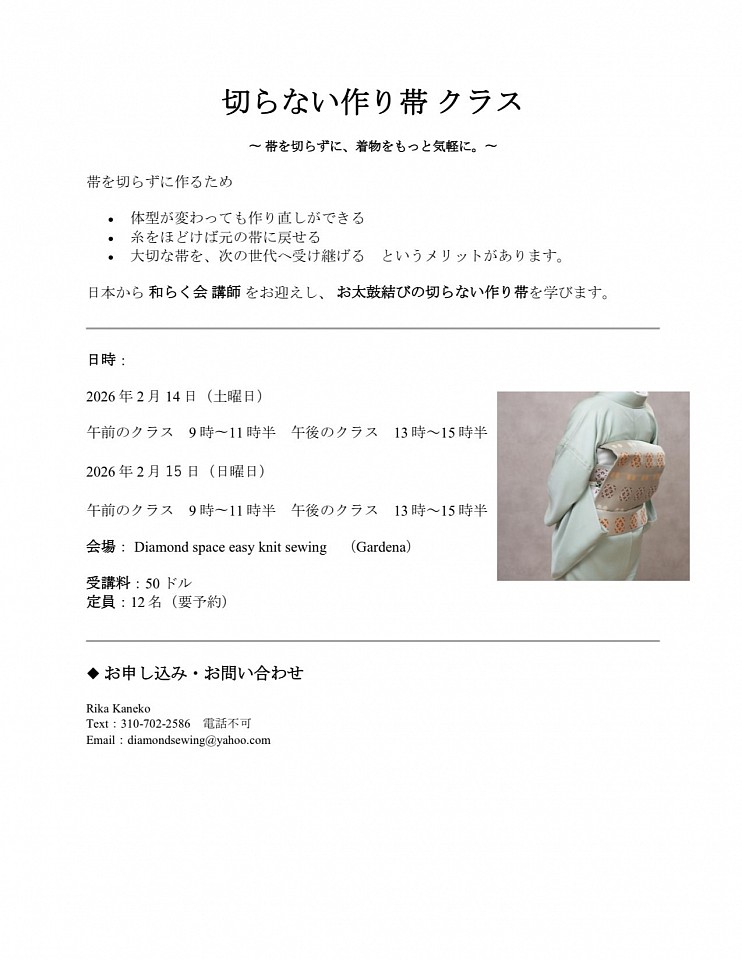 Diamond Space Easy Knit Sewing opened in 2013 as a knit sewing class.Over the years, based on our customers’ requests, we have expanded our programs to include sewing classes for children in the U.S., where home economics is not commonly taught, as well as Western dressmaking, Japanese tailoring (wafuku), kimono remake classes, and two-piece kimono classes.Starting in February 2026, we will introduce the No-Cut Tsukuri-Obi Class by Waraku-kai, a popular program in Japan.